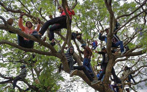 Protesters climb trees to view the crowd at a demonstration at Zimbabwe Grounds in Harare, Zimbabwe, Saturday, Nov. 18, 2017. Opponents of Mugabe are demonstrating for the ouster of the 93-year-old leader who is virtually powerless and deserted by most of his allies. (AP Photo/Ben Curtis)