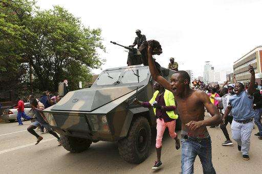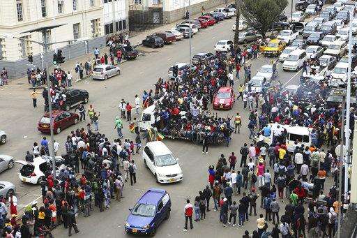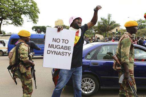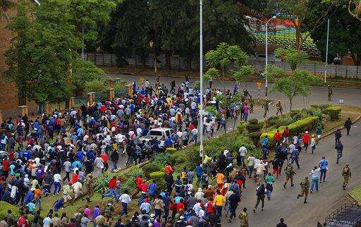 Protesters demanding that President Robert Mugabe stands down, break through a cordon and run towards State House, before being stopped by another army cordon, on the road leading to State House in Harare, Zimbabwe Saturday, Nov. 18, 2017. In a euphoric gathering that just days ago would have drawn a police crackdown, crowds marched through Zimbabwe's capital on Saturday to demand the departure of President Robert Mugabe, one of Africa's last remaining liberation leaders, after nearly four decades in power. (AP Photo/Ben Curtis)