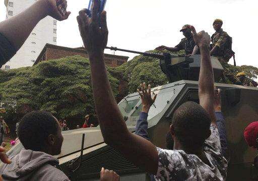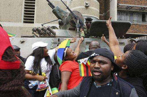 Euphoric crowds greet armed soldiers while marching on the streets of Harare, demanding the departure of President Robert Mugabe, Saturday Nov, 18, 2017. Zimbabweans giddy with joy raced through intersections, raising their arms in triumph. (AP Photo/Tsvangirayi Mukwazhi)