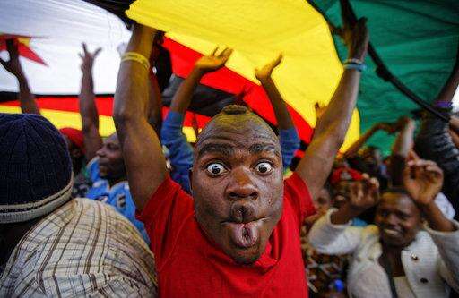 A happy protester pulls a face as he and others stand under a large national flag, at a demonstration of tens of thousands at Zimbabwe Grounds in Harare, Zimbabwe Saturday, Nov. 18, 2017. Opponents of Mugabe are demonstrating for the ouster of the 93-year-old leader who is virtually powerless and deserted by most of his allies. (AP Photo/Ben Curtis)