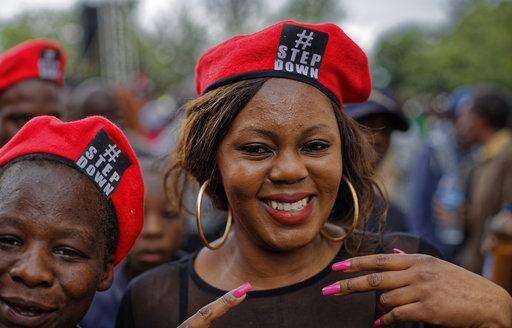 A protester wears a beret at a demonstration at Zimbabwe Grounds in Harare, Zimbabwe Saturday, Nov. 18, 2017. Opponents of Mugabe are demonstrating for the ouster of the 93-year-old leader who is virtually powerless and deserted by most of his allies. (AP Photo/Ben Curtis)