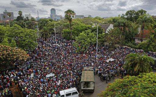 A crowd of thousands of protesters demanding President Robert Mugabe stands down gather behind an army cordon on the road leading to State House in Harare, Zimbabwe Saturday, Nov. 18, 2017. In a euphoric gathering that just days ago would have drawn a police crackdown, crowds marched through Zimbabwe's capital on Saturday to demand the departure of President Robert Mugabe, one of Africa's last remaining liberation leaders, after nearly four decades in power. (AP Photo/Ben Curtis)