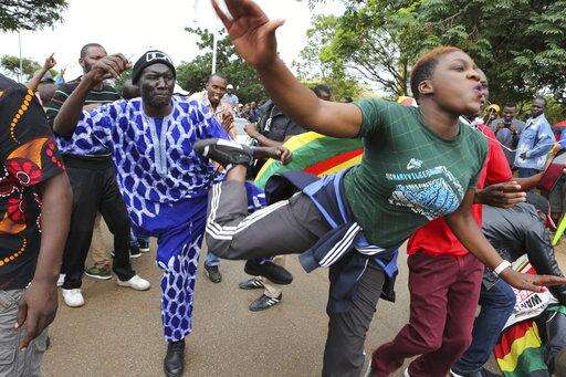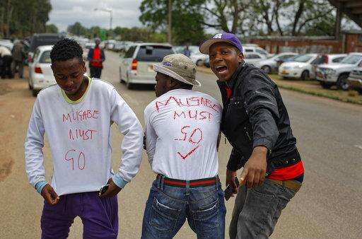 Protesters dance and sing, one holding a poster asking President Mugabe to step down, at a demonstration at Zimbabwe Grounds in Harare, Zimbabwe Saturday, Nov. 18, 2017. Opponents of President Robert Mugabe are demonstrating for the ouster of the 93-year-old leader who is virtually powerless and deserted by most of his allies. (AP Photo/Ben Curtis)