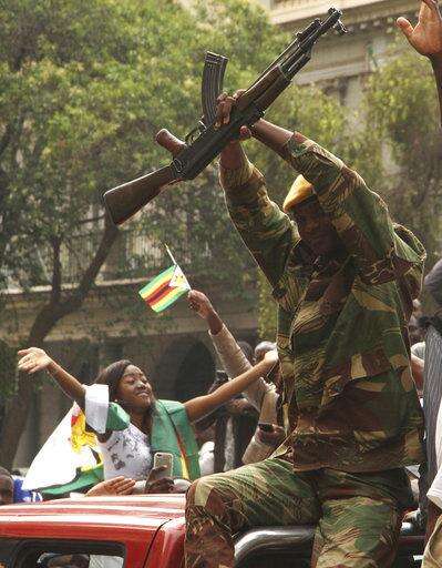 A woman cheers on a soldier as hundreds gather in Bulawayo, Zimbabwe, Saturday, Nov. 18, 2017 to demand the departure of President Robert Mugabe after nearly four decades in power. (AP Photo?Tawanda Mudimu)