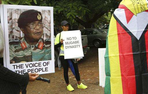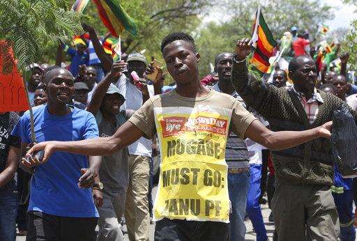 People gather to demonstrate for the ouster of 93-year-old President Robert Mugabe who is virtually powerless and deserted by most of his allies, in Harare, Zimbabwe, Saturday, Nov. 18, 2017. (AP Photo/Ben Curtis)