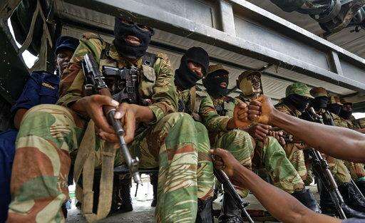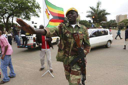 Armed soldiers control traffic as euphoric crowds march on the streets Saturday, Nov. 18, 2017, in Harare, Zimbabwe, demanding the departure of President Robert Mugabe. Zimbabweans giddy with joy raced through intersections, raising their arms in triumph. (AP Photo/Tsvangirayi Mukwazhi)