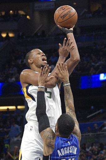 Utah Jazz guard Rodney Hood (5) goes up for a shot in front of Orlando Magic guard D.J. Augustin (14) during the first half of an NBA basketball game, Saturday, Nov. 18, 2017, in Orlando, Fla. (AP Photo/Phelan M. Ebenhack) The Associated Press