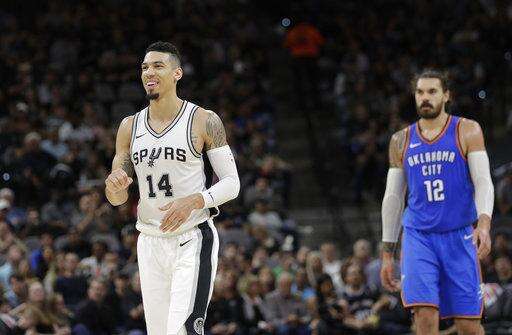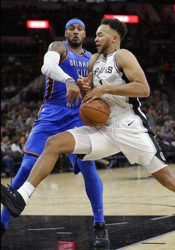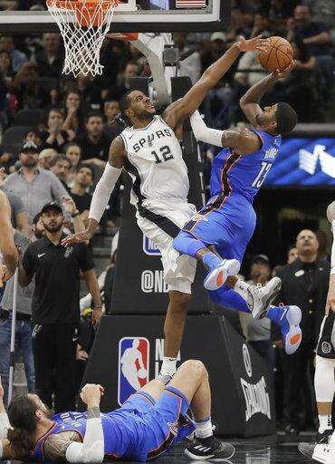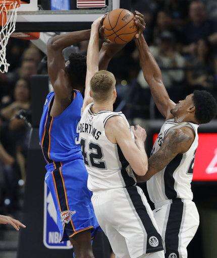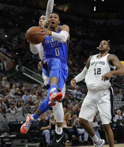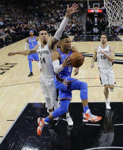 Thunder: Oklahoma City entered the game leading the league in steals (10.4) and opponent turnovers (19.0). The Spurs had 13 turnovers, most coming in the first quarter. The Thunder have never finished in the top five in either category since leaving Seattle. ... Westbrook, Anthony and George have split game-high scoring honors throughout the season. George has led six times and Westbrook and Anthony have done so on five occasions each. ... Nick Collison did not play for the 14th time this season. The 15-year veteran played five minutes in his only appearance of the season.