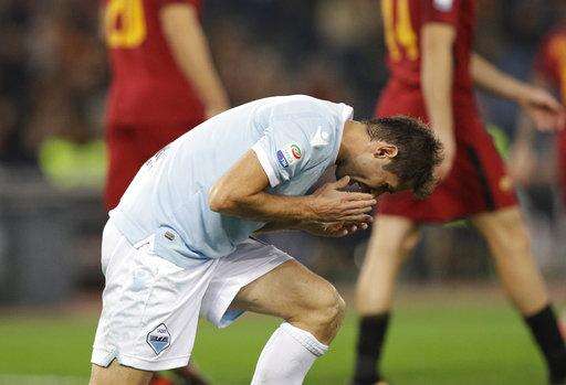 Lazio's Senad Lulic reacts after missing a scoring chance during an Italian Serie A soccer match between AS Roma and Lazio, at the Olympic stadium in Rome, Saturday, Nov. 18, 2017. (AP Photo/Andrew Medichini) The Associated Press