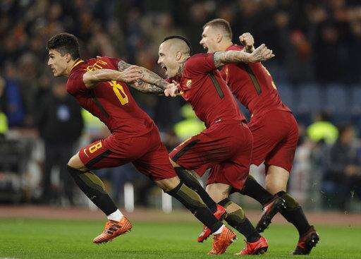 Roma's Diego Perotti, left, celebrates with teammates Radia Nainggolan and Edin Dzeko, after scoring first goal during an Italian Serie A soccer match between AS Roma and Lazio, at the Olympic stadium in Rome, Saturday, Nov. 18, 2017. (AP Photo/Andrew Medichini) The Associated Press