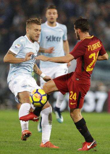 Lazio's Ciro Immobile, left, and Roma's Alessandro Florenzi vie for the ball during an Italian Serie A soccer match between AS Roma and Lazio, at the Olympic stadium in Rome, Saturday, Nov. 18, 2017. (AP Photo/Andrew Medichini) The Associated Press