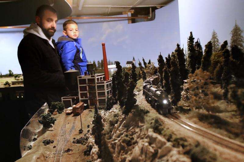 Tom Battista of Wauconda brings his son, Charlie, 4, to look at the trains Sunday during the Lake County Model Railroad Club's fall open house in Wauconda. Gilbert R. Boucher II/gboucher@dailyherald.com