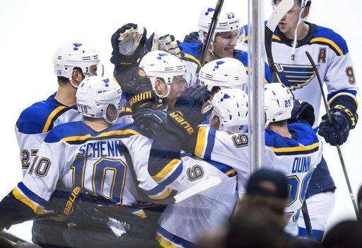 St. Louis Blues' Brayden Schenn (10) and teammates celebrate his overtime goal against the Vancouver Canucks during an NHL hockey game Saturday, Nov. 18, 2017, in Vancouver, British Columbia. (Darryl Dyck/The Canadian Press via AP) The Associated Press