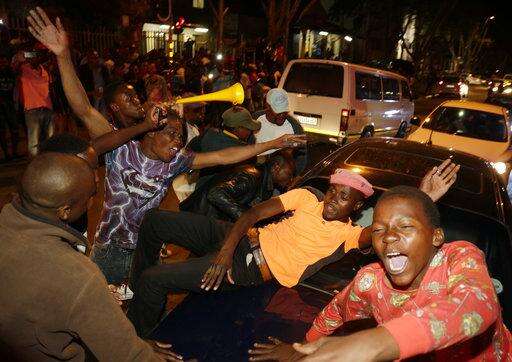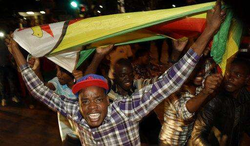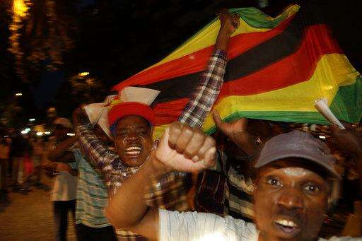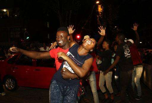 Zimbabweans celebrate in Harare, Tuesday, Nov, 21, 2017, after the resignation of President Robert Mugabe. Zimbabwe's President Robert Mugabe says he is resigning immediately and voluntarily in order to have a "smooth transfer of power" after 37 years in charge. (AP Photo/Tsvangirayi Mukwazhi)