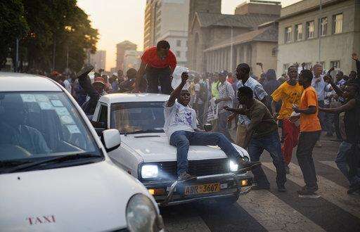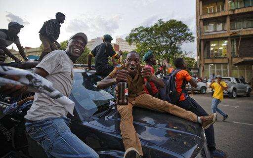Zimbabweans celebrate and ride on cars outside the parliament building immediately after hearing the news that President Robert Mugabe had resigned, in downtown Harare, Zimbabwe Tuesday, Nov. 21, 2017. Mugabe resigned as president with immediate effect Tuesday after 37 years in power, shortly after parliament began impeachment proceedings against him. (AP Photo/Ben Curtis)