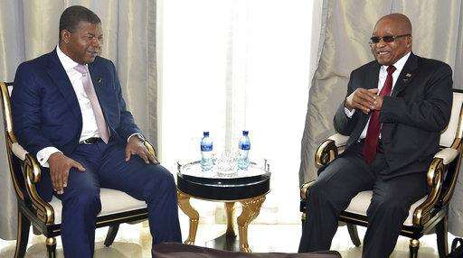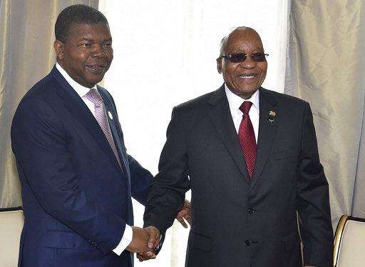In this photo supplied by South African Communication and Information Services (GCIS), Angolan President Joao Lourenco, left, and his South African counterpart Jacob Zuma, meet in Luanda, Angola, Tuesday, Nov. 21 2017. Zuma is in Angola as head of the inter-governmental organization SADC (Southern African Development Community) to discuss the situation in Zimbabwe. (Elmond Jiyane, GCIS, via AP)