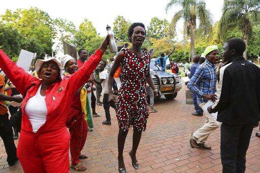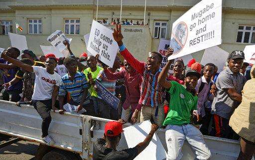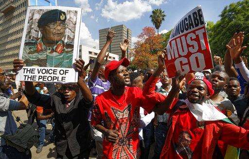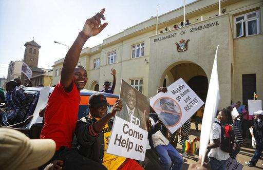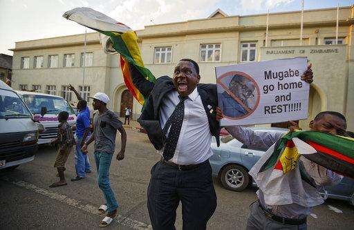 Demonstrators protest outside the Zimbabwean Parliament in Harare, Tuesday, Nov. 21, 2017 calling for Parliament to impeach President Robert Mugabe who has been in power for nearly four decades. Zimbabwean President Robert Mugabe should acknowledge the nation's "insatiable desire" for a leadership change and resign immediately, the recently fired vice president and likely successor to the 93-year-old leader said Tuesday, as impeachment proceedings began against the world's oldest head of state. (AP Photo/Ben Curtis)