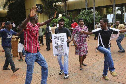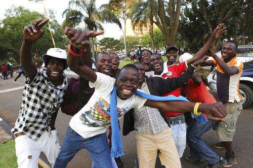 Zimbabweans celebrate after hearing about the resignation of President Robert Mugabe in Harare, Tuesday, Nov, 21, 2017. Zimbabwe's Parliament erupted in cheers Tuesday after the speaker announced the resignation of President Robert Mugabe after 37-years in power. (AP Photo/Tsvangirayi Mukwazhi)