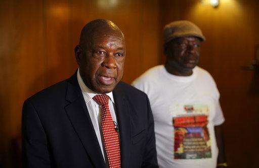 Chris Mutsvangwa, head of Zimbabwe's association of war veterans, speaks to The Associated Press calling for President Robert Mugabe to step down immediately, in downtown Harare, Zimbabwe Tuesday, Nov. 21, 2017. The ruling ZANU-PF party was poised to begin impeachment proceedings Tuesday against Mugabe after its Central Committee voted to oust the president as party leader. (AP Photo/Ben Curtis)