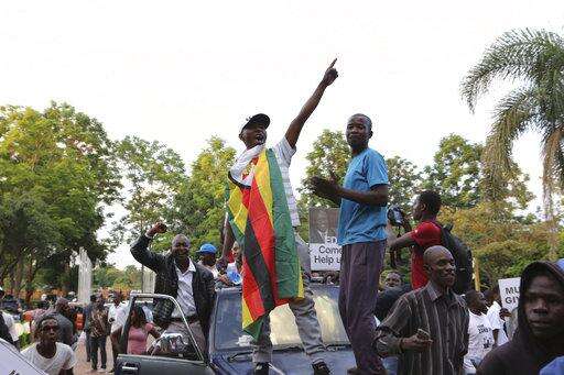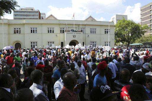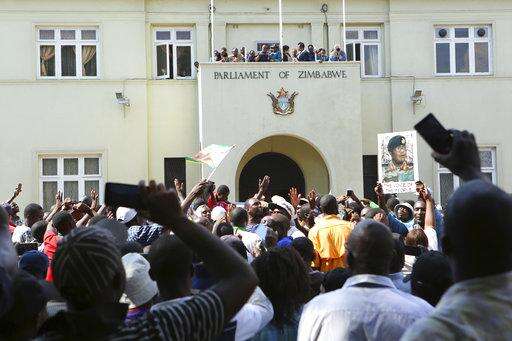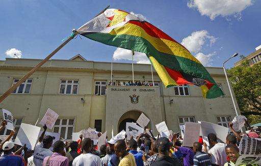 Protesters calling for the impeachment of President Robert Mugabe demonstrate outside the parliament building in downtown Harare, Zimbabwe Tuesday, Nov. 21, 2017. (AP Photo/Ben Curtis)