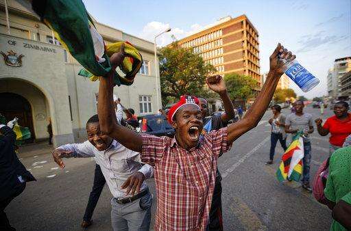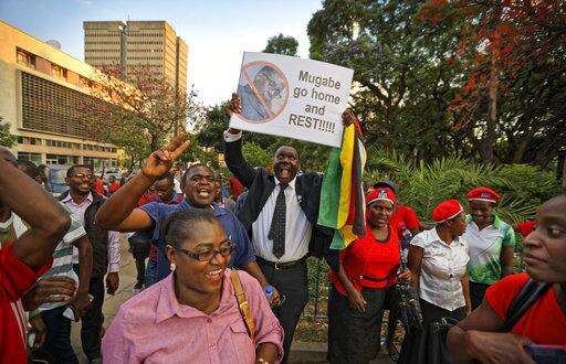 Zimbabweans celebrate outside the parliament building immediately after hearing the news that President Robert Mugabe had resigned, in downtown Harare, Zimbabwe Tuesday, Nov. 21, 2017. Mugabe resigned as president with immediate effect Tuesday after 37 years in power, shortly after parliament began impeachment proceedings against him. (AP Photo/Ben Curtis)