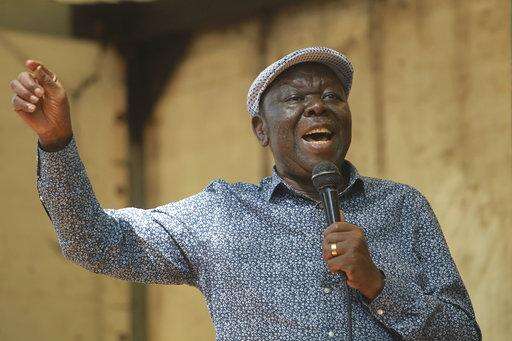 Morgan Tsvangirai, the main opposition leader in Zimbabwe addresses protestors outside parliament building in Harare, Tuesday, Nov, 21, 2017. Parliament opened in Zimbabwe as the ruling party seeks to impeach President Robert Mugabe after nearly four decades in power. (AP Photo/Tsvangirayi Mukwazhi)