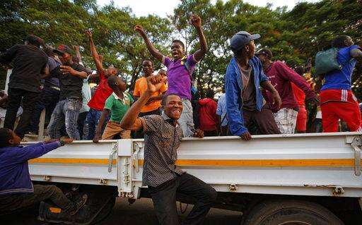 Protesters calling for the impeachment of President Robert Mugabe ride in a truck as they demonstrate in front of the parliament building in downtown Harare, Zimbabwe Tuesday, Nov. 21, 2017. (AP Photo/Ben Curtis)
