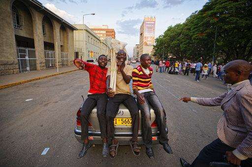 Zimbabweans celebrate in the streets of Harare, after President Robert Mugabe resigned in Harare, Tuesday, Nov, 21, 2017. Zimbabwe's Parliament erupted in cheers Tuesday after the speaker announced the resignation of President Robert Mugabe after 37-years in power. (AP Photo/Tsvangirayi Mukwazhi)