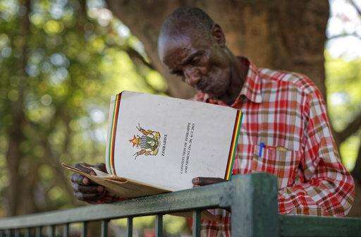 An unemployed man reads up on Zimbabwean constitutional law to understand the process of possible presidential impeachment, in a park opposite the parliament building in downtown Harare, Zimbabwe Tuesday, Nov. 21, 2017. Zimbabwean President Robert Mugabe should acknowledge the nation's "insatiable desire" for a leadership change and resign immediately, the recently fired vice president and likely successor to the 93-year-old leader said Tuesday. (AP Photo/Ben Curtis)