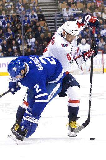 Washington Capitals' Alex Ovechkin, right, takes the puck past Toronto Maple Leafs' Ron Hainsey during the third period of an NHL hockey game in Toronto on Saturday, Nov. 25, 2017. (Chris Young/The Canadian Press via AP) The Associated Press