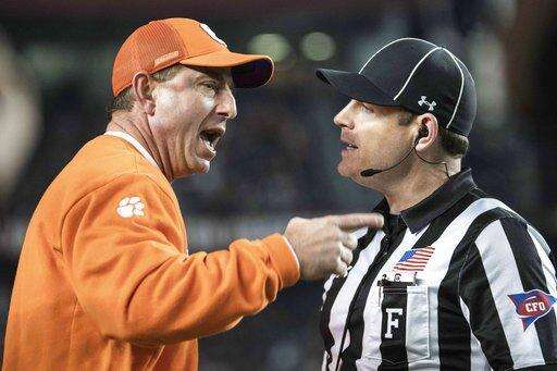 Clemson coach Dabo Swinney was called for an unsportsmanlike penalty after apparently yelling at officials a bit too often with language that was a little too salty. The penalty came as Swinney wandered too far onto the field following Renfrow's 4-yard touchdown catch in the second quarter. Swinney was upset that fans near the end zone were tossing water bottles and debris on the field. He wanted officials to penalize South Carolina. "That's what I thought," he said. "But I got a flag. Should have kept my mouth shut. "