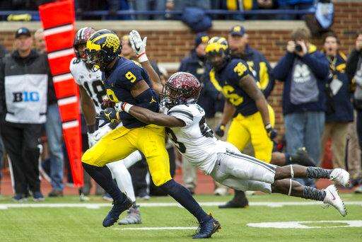 O'Korn, a fifth-year senior who transferred from Houston after his second season in college, missed tight end Tyrone Wheatley to end the first drive and struggled for much of the game to connect with open teammates. He finished 17 of 32 for 195 yards with a 3-yard TD pass to Sean McKeon that put the Wolverines up 14-0 early.