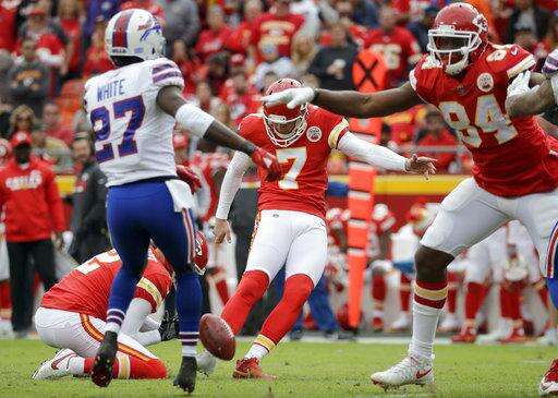 Kansas City Chiefs kicker Harrison Butker (7) kicks his 23rd consecutive field goal between Buffalo Bills cornerback Tre'Davious White (27) and tight end Demetrius Harris (84), during the first half of an NFL football game in Kansas City, Mo., Sunday, Nov. 26, 2017. (AP Photo/Charlie Riedel) The Associated Press