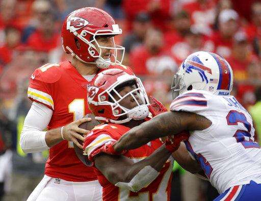 Kansas City Chiefs quarterback Alex Smith (11) looks to pass as running back Kareem Hunt (27) blocks Buffalo Bills cornerback Leonard Johnson (24) during the first half of an NFL football game in Kansas City, Mo., Sunday, Nov. 26, 2017. (AP Photo/Charlie Riedel) The Associated Press