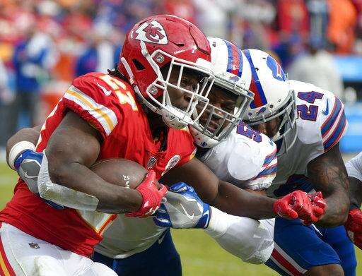 Kansas City Chiefs running back Kareem Hunt (27) is tackled by Buffalo Bills linebacker Preston Brown (52) and cornerback Leonard Johnson (24) during the first half of an NFL football game in Kansas City, Mo., Sunday, Nov. 26, 2017. (AP Photo/Ed Zurga) The Associated Press