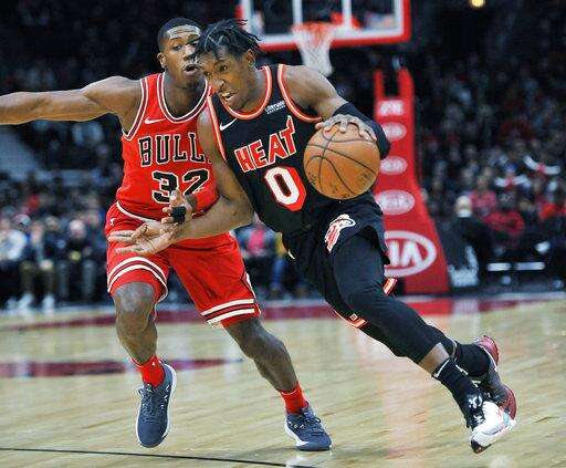 Miami Heat's Josh Richardson (0) drives against Chicago Bulls' Kris Dunn (32) during the first half of an NBA basketball game, Sunday, Nov. 26, 2017, in Chicago. (AP Photo/Paul Beaty) The Associated Press
