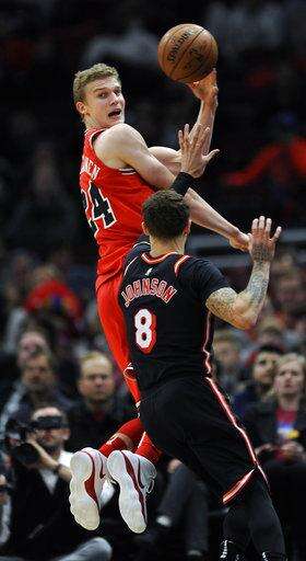Chicago Bulls' Lauri Markkanen (24), of Finland, saves the ball from going out of bounds while passing against Miami Heat's Tyler Johnson (8) during the first half of an NBA basketball game, Sunday, Nov. 26, 2017, in Chicago. (AP Photo/Paul Beaty) The Associated Press