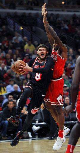 Miami Heat's Tyler Johnson (8) goes up for a shot against Chicago Bulls' Antonio Blakeney (9) during the first half of an NBA basketball game, Sunday, Nov. 26, 2017, in Chicago. (AP Photo/Paul Beaty) The Associated Press