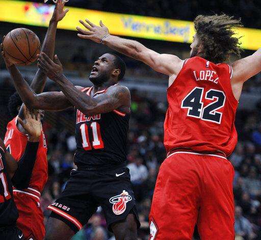 Miami Heat's Dion Waiters (11) goes up for a shot against Chicago Bulls' Robin Lopez (42) and Justin Holiday (7) during the first half of an NBA basketball game, Sunday, Nov. 26, 2017, in Chicago. (AP Photo/Paul Beaty) The Associated Press