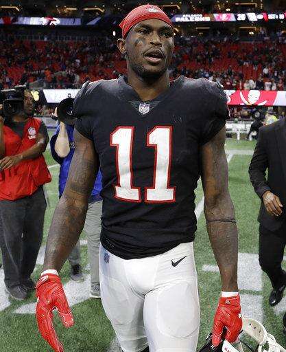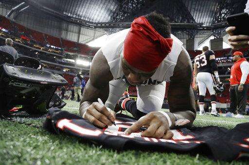 Atlanta Falcons wide receiver Mohamed Sanu signs his jersey after an NFL football game between the Atlanta Falcons and the Tampa Bay Buccaneers, Sunday, Nov. 26, 2017, in Atlanta. The Atlanta Falcons won 34-20. (AP Photo/Chris O'Meara) The Associated Press