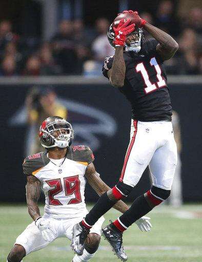 Atlanta Falcons wide receiver Julio Jones (11) makes the catch ahead of Tampa Bay Buccaneers cornerback Ryan Smith (29) during the second half of an NFL football game, Sunday, Nov. 26, 2017, in Atlanta. (AP Photo/John Bazemore) The Associated Press