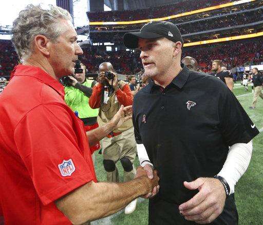 Tampa Bay Buccaneers head coach Dirk Koetter, left, speaks with Atlanta Falcons head coach Dan Quinn an NFL football game, Sunday, Nov. 26, 2017, in Atlanta. The Atlanta Falcons won 34-20. (AP Photo/John Bazemore) The Associated Press