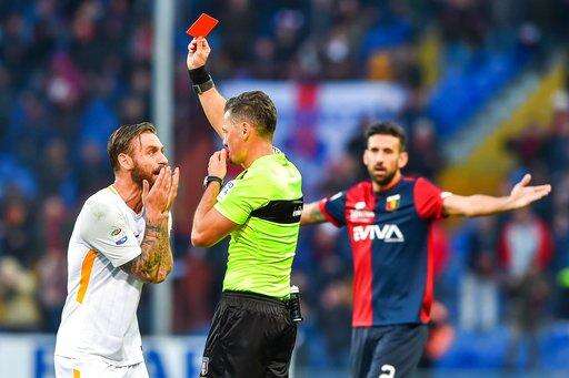 Referee Piero Giacomelli shows Roma's Daniele De Ross a red card, during the Serie A soccer match between Genoa and Roma, at the Luigi Ferraris Stadium in Genoa, Italy, Sunday, Nov. 26, 2017. (Simone Arveda/ANSA via AP) The Associated Press