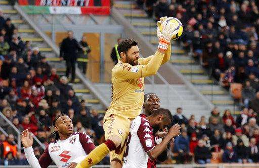 Torino goalkeeper Salvatore Sirigu grabs the ball during the Serie A soccer match between AC Milan and Torino at the San Siro stadium in Milan, Italy, Sunday, Nov. 26, 2017. (AP Photo/Antonio Calanni) The Associated Press