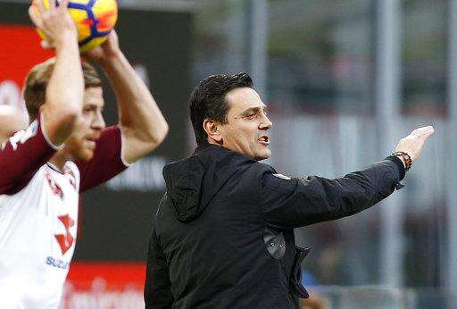 AC Milan coach Vincenzo Montella gives indications during the Serie A soccer match between AC Milan and Torino at the San Siro stadium in Milan, Italy, Sunday, Nov. 26, 2017. (AP Photo/Antonio Calanni) The Associated Press