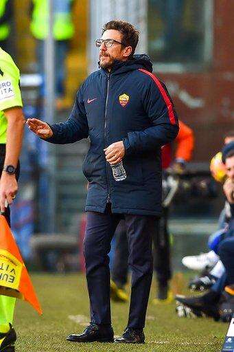 Roma coach Eusebio Di Francesco stands on the pitch during the Serie A soccer match between Genoa and Roma, at the Luigi Ferraris Stadium in Genoa, Italy, Sunday, Nov. 26, 2017. (Simone Arveda/ANSA via AP) The Associated Press