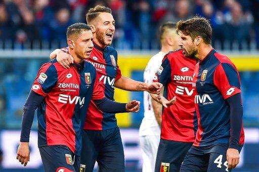 Genoa's Gianluca Lapadula, left, celebrates with his teammates Andrea Bertolacci and Miguel Veloso, right, after scoring on a penalty kick, during the Serie A soccer match between Genoa and Roma, at the Luigi Ferraris Stadium in Genoa, Italy, Sunday, Nov. 26, 2017. (Simone Arveda/ANSA via AP) The Associated Press