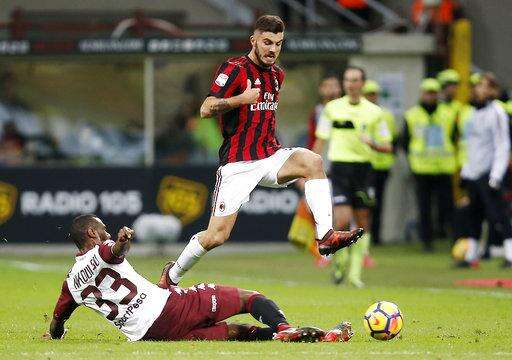AC Milan's Patrick Cutrone, top, is tackled by Torino's Nicolas N'koulou during the Serie A soccer match between AC Milan and Torino at the San Siro stadium in Milan, Italy, Sunday, Nov. 26, 2017. (AP Photo/Antonio Calanni) The Associated Press