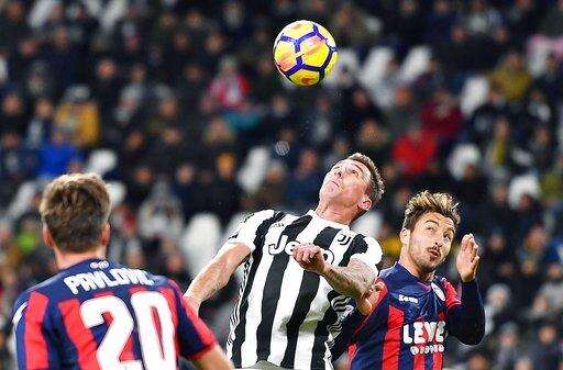 Juventus's forward Mario Mandzukic, center, jumps for the ball during a Serie A soccer match between Juventus and Crotone at the Allianz Stadium in Turin, Italy, Sunday, Nov. 26, 2017. (Alessandro Di Marco/ANSA via AP) The Associated Press