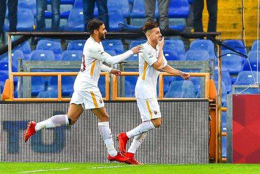 Rom's Stephan El Shaarawy's, right, celebrates with his teammate Andre Gregoire Defrel after scoring, during the Serie A soccer match between Genoa and Roma, at the Luigi Ferraris Stadium in Genoa, Italy, Sunday, Nov. 26, 2017. (Simone Arveda/ANSA via AP) The Associated Press
